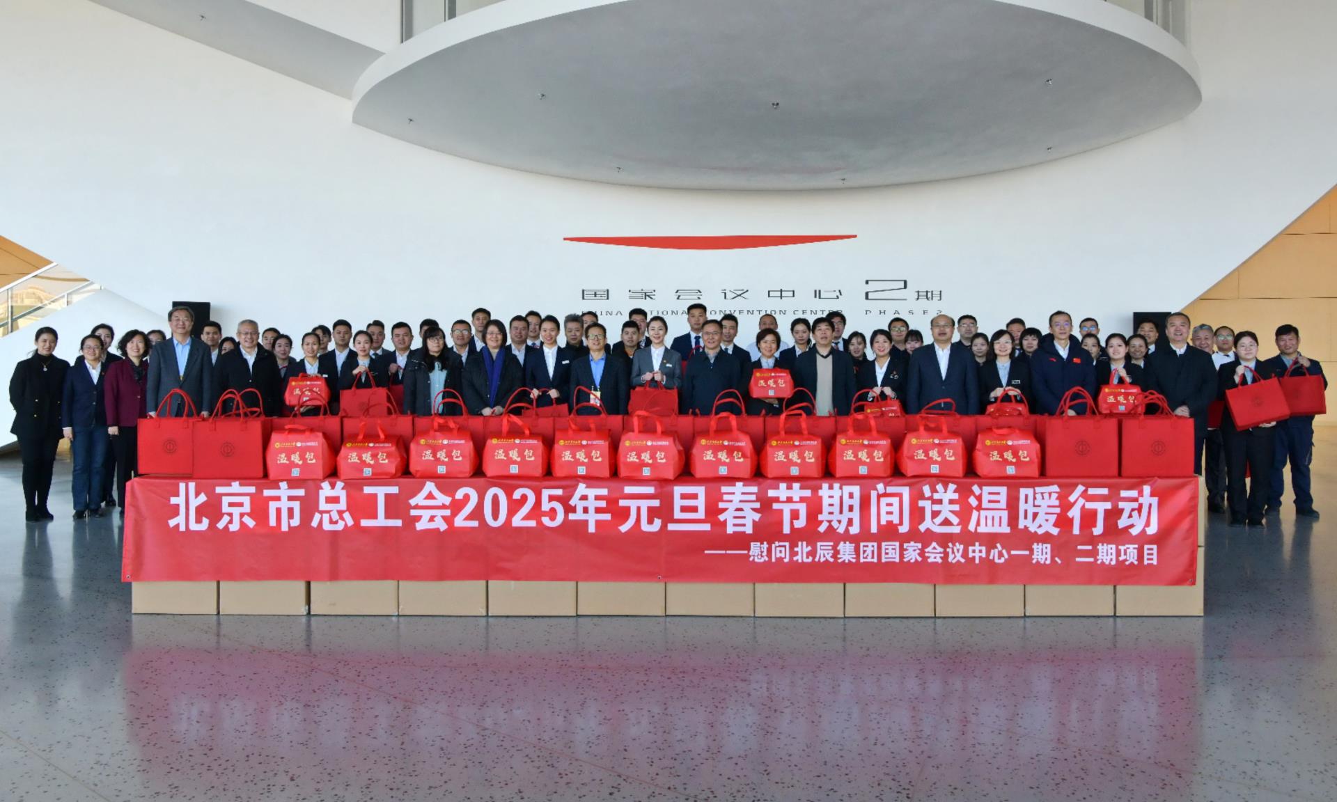 1月13日下午,北京市总工会党组成员、副主席于德泉,北京市建筑产业工会副主席、一级调研员张宇晶,来到9U.COM九游体育(中国大陆)科技公司国家会议中心一期、二期场馆现场,开展2025年元旦春节“冬送温暖”活动,慰问重点项目一线的干部职工,并向他们送上温暖包和新年祝福。